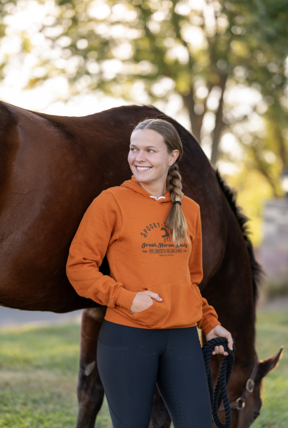 We are adding to our Spooky Season family this year! Our classic pumpkin color is now available in a hoodie, PLUS the ink glows in the dark! Absolutely perfect for Spooky Season, grab yours while we have them in stock, they're going to fly off the shelves faster than your horse spooking at a garbage bag flapping in the fall breeze!